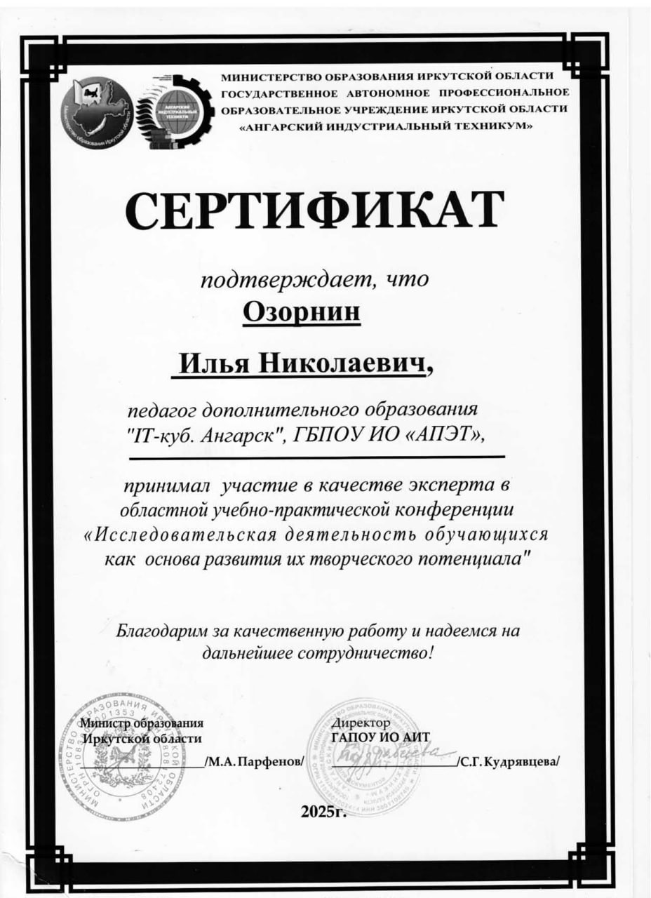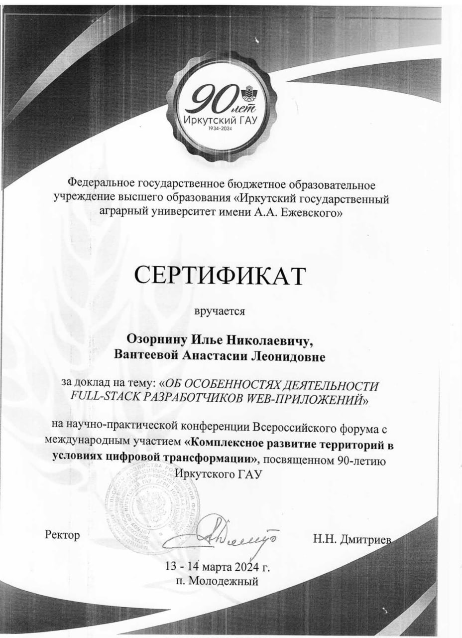 Имею специальное профессиональное образование по специальности "Информационные системы и технологии" квалификация "Администратор баз данных". Выступал на международной научно-практической конференции «Комплексное развитие территорий в условиях цифровой трансформации» и являюсь автором статьи "ОБ ОСОБЕННОСТЯХ ДЕЯТЕЛЬНОСТИ FULL-STACK WEB-РАЗРАБОТЧИКОВ".